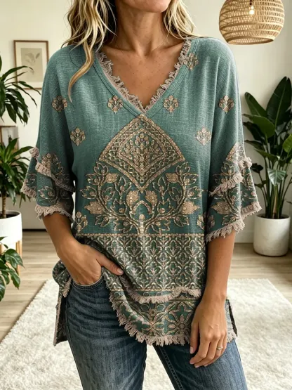 Women's Vintage Folk Art Print V-Neck Tasseled Cotton Top