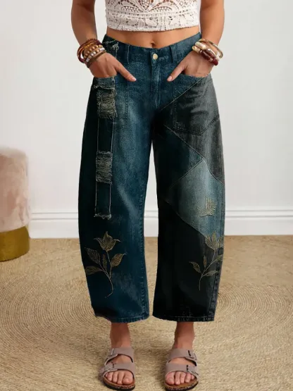 Women's Vintage Patchwork Art Print Denim Jeans