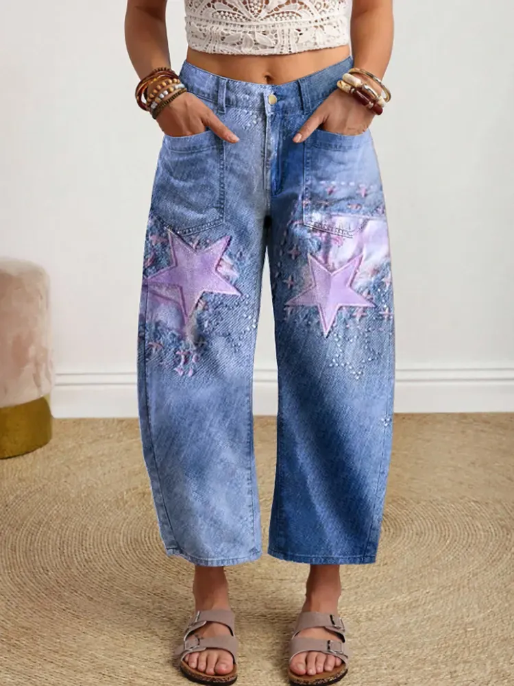 Women's Vintage Textured Pink Star Art Print Denim Jeans