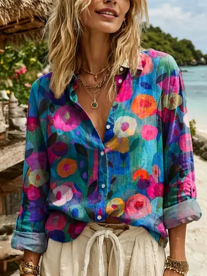 Women's Watercolor Floral Art Pattern Printed Long-Sleeved Cotton Linen Shirt