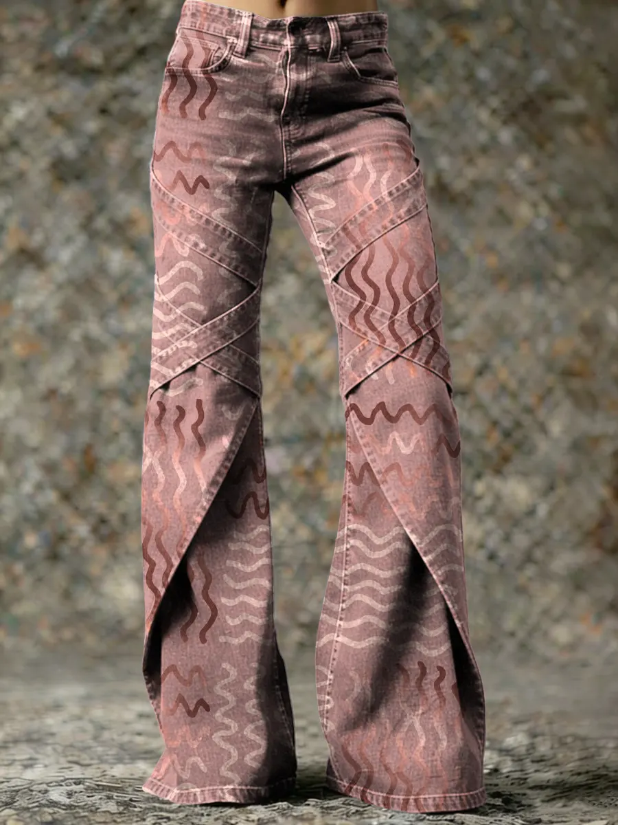 Women's Wavy Lines Print Washed Cotton Ruffled Denim Jeans