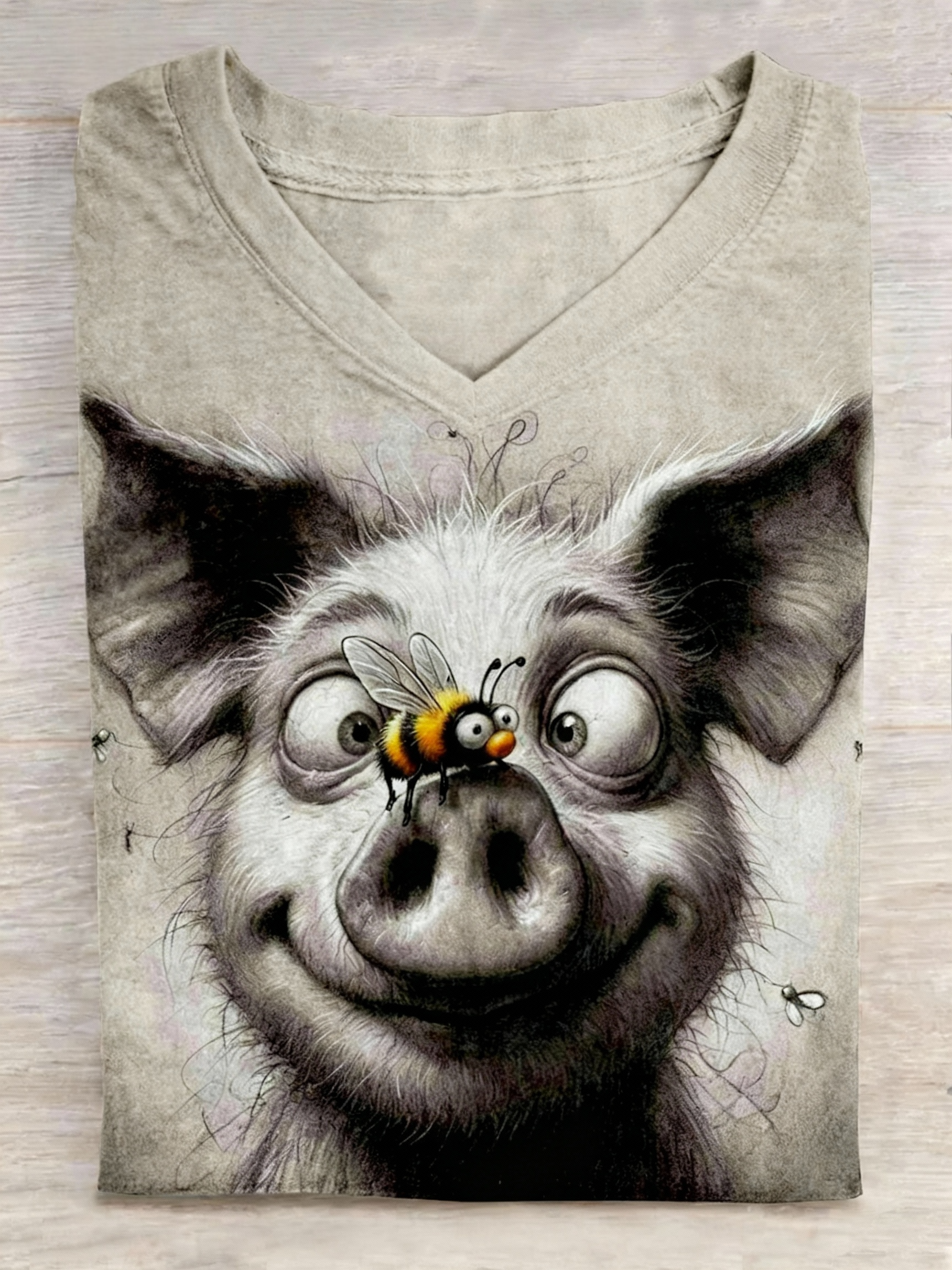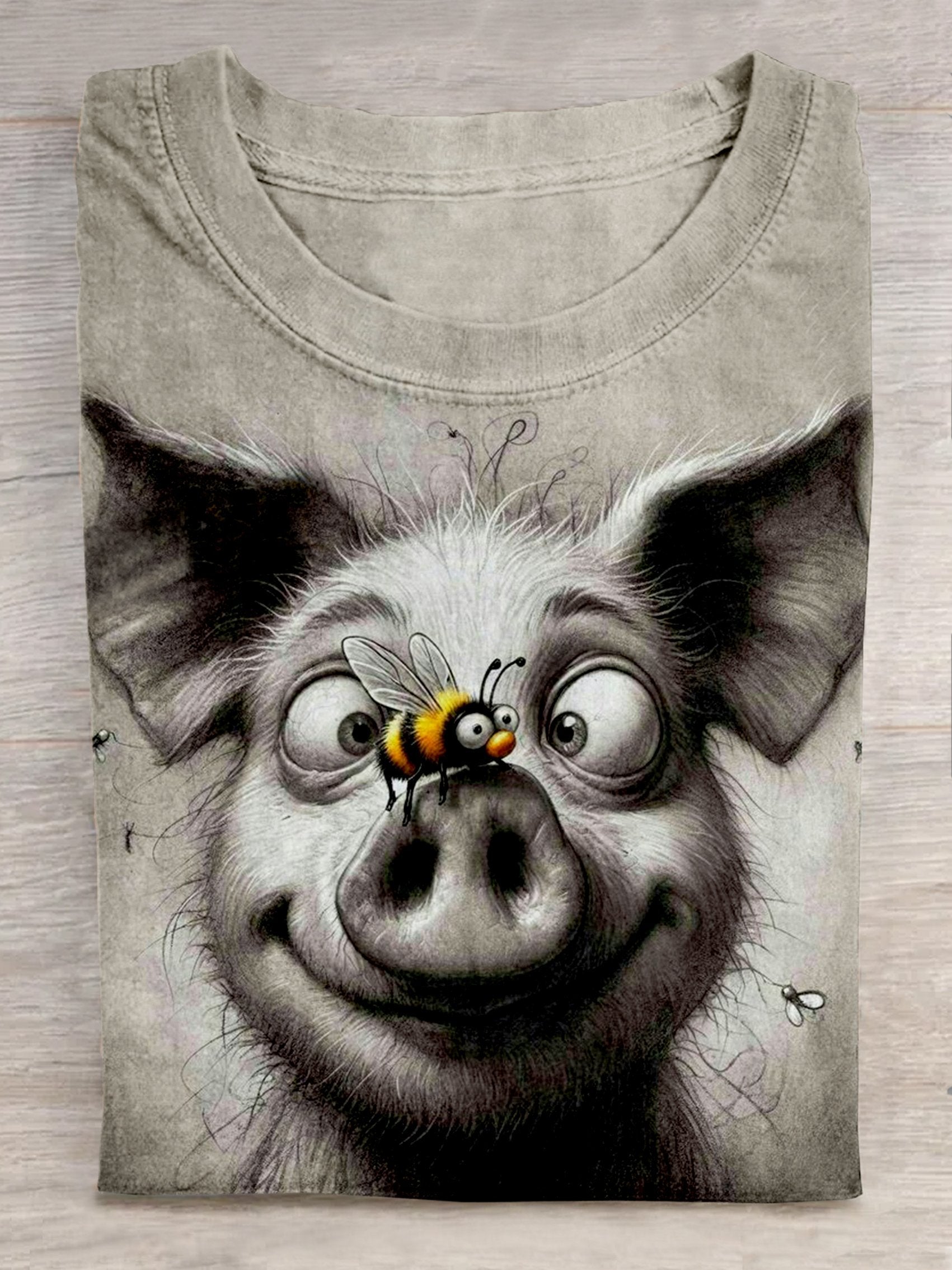 Cute Pig And Bee Art Print Casual Short Sleeve T-shirt