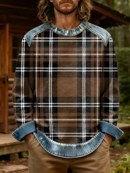 Ethnicity Brown Check Pattern Men's Art Print Long Sleeve Denim Mix Casual Sweatshirt