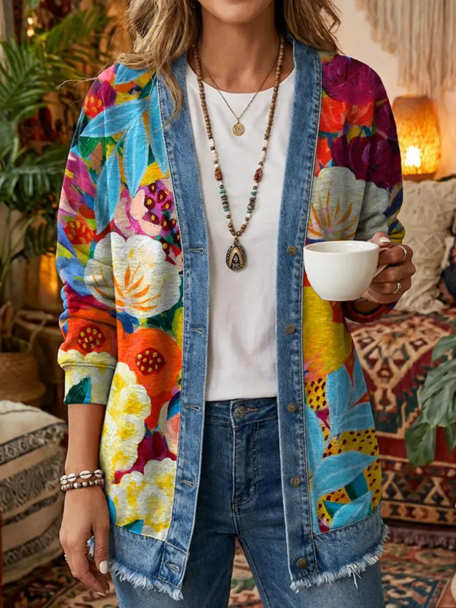Ethnicity Colorful Flowers Geometry Women's Art Print Casual Long Sleeve Denim Patchwork Shirt Coat