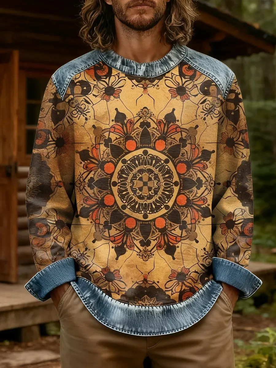 Ethnicity Geometry Kaleidoscope Men's Art Print Long Sleeve Denim Mix Casual Sweatshirt