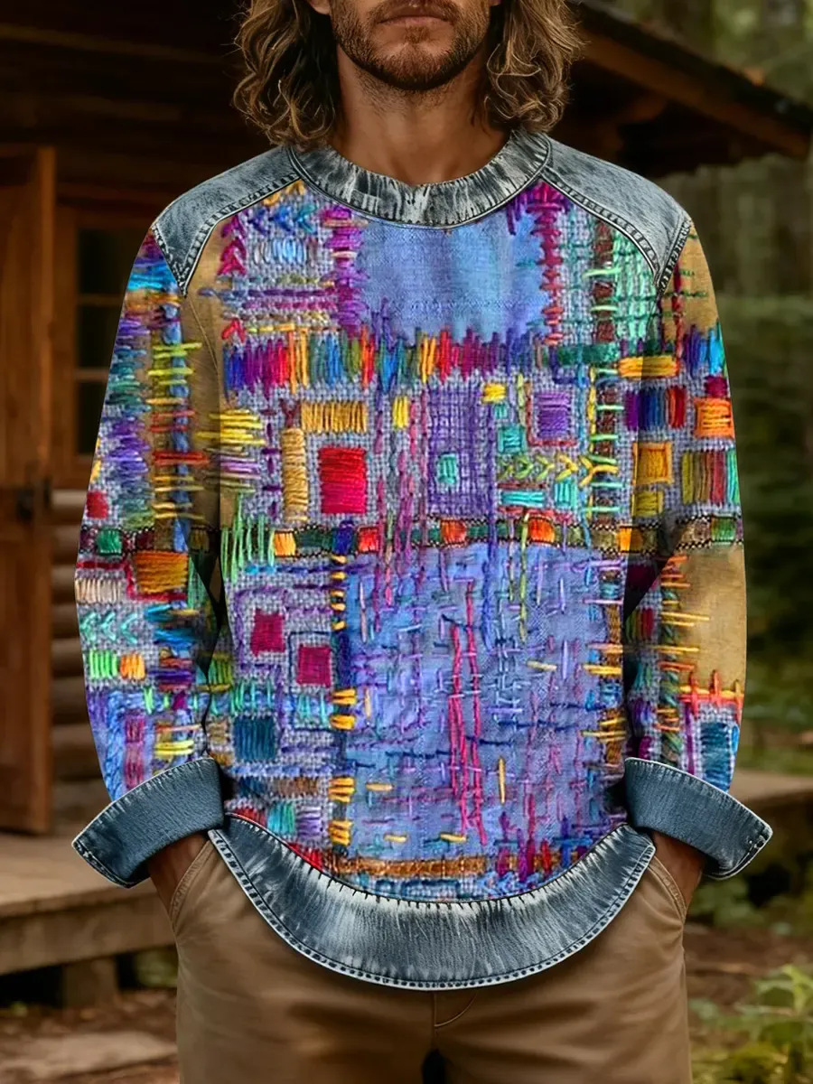 Ethnicity Geometry Texture Men's Art Print Long Sleeve Denim Mix Casual Sweatshirt