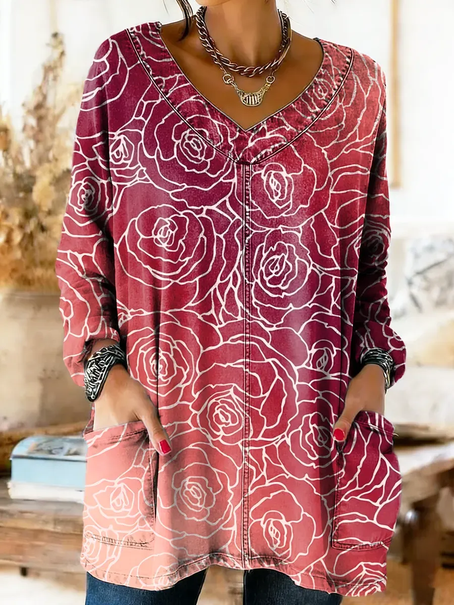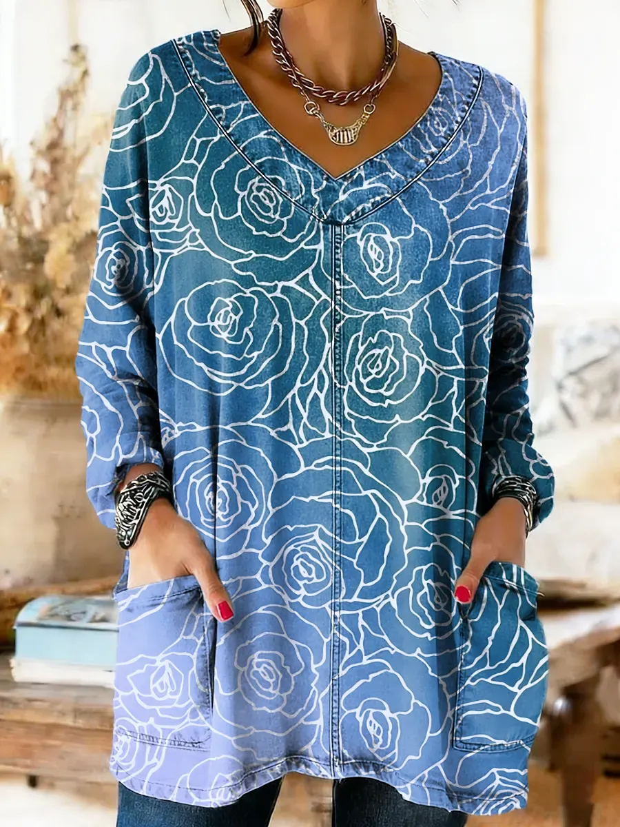 Ethnicity Rose Flowers Gradation Women's Art Print Casual Pocket Washed Denim Cotton Top