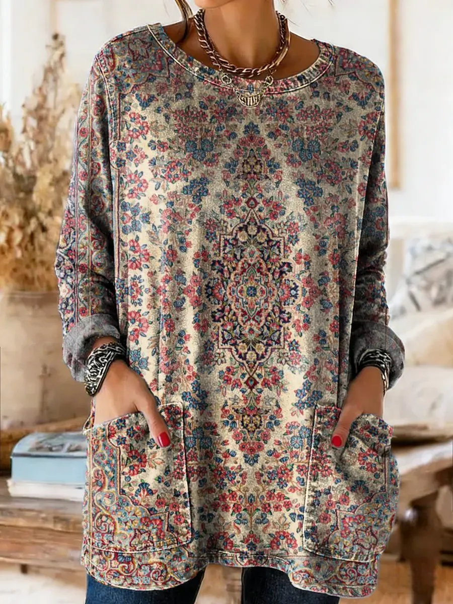 Ethnicity Totem Geometry Flowers Women's Casual Long-sleeve Crew Neck Pocket Washed Cotton Denim T-shirt