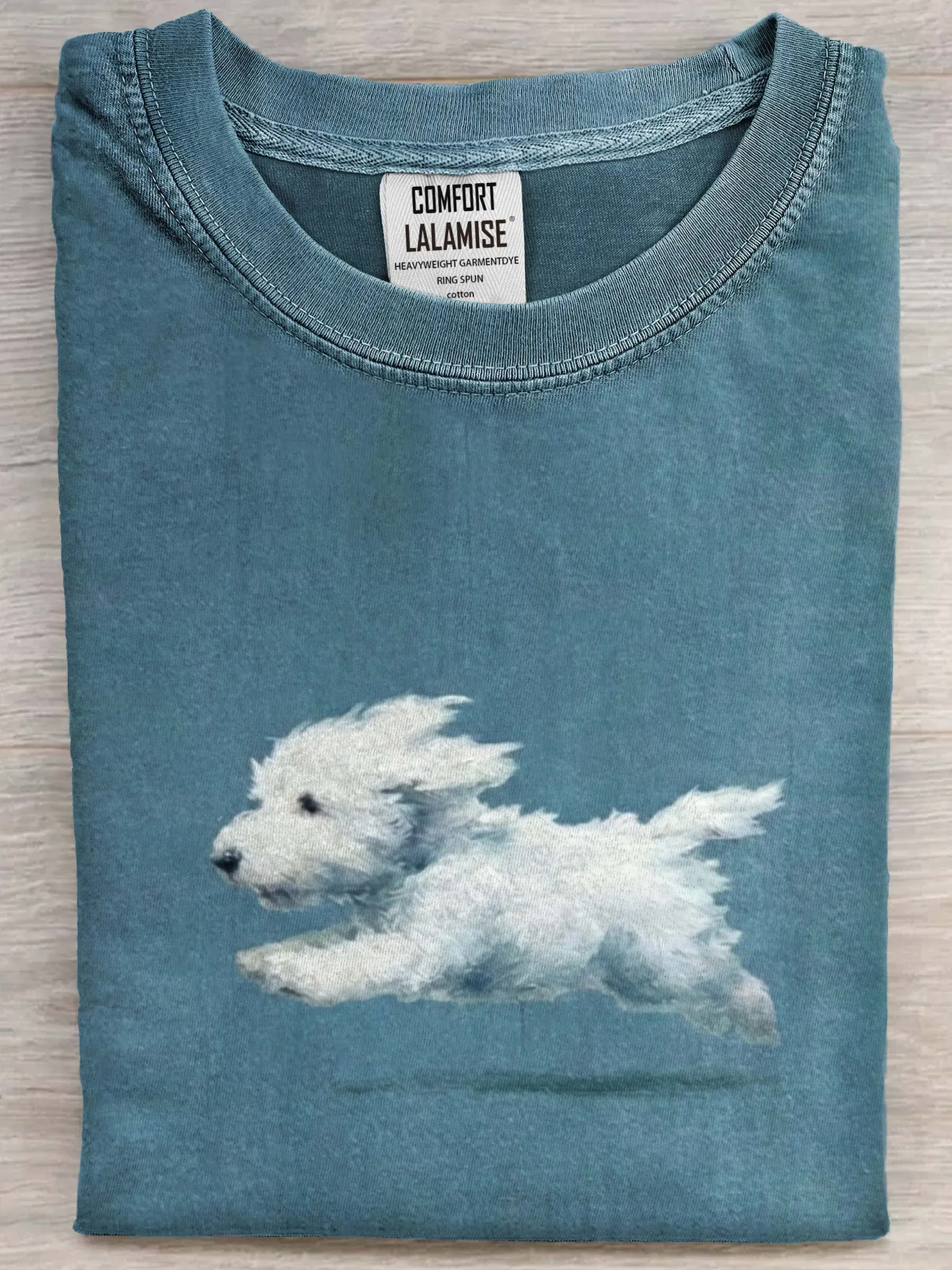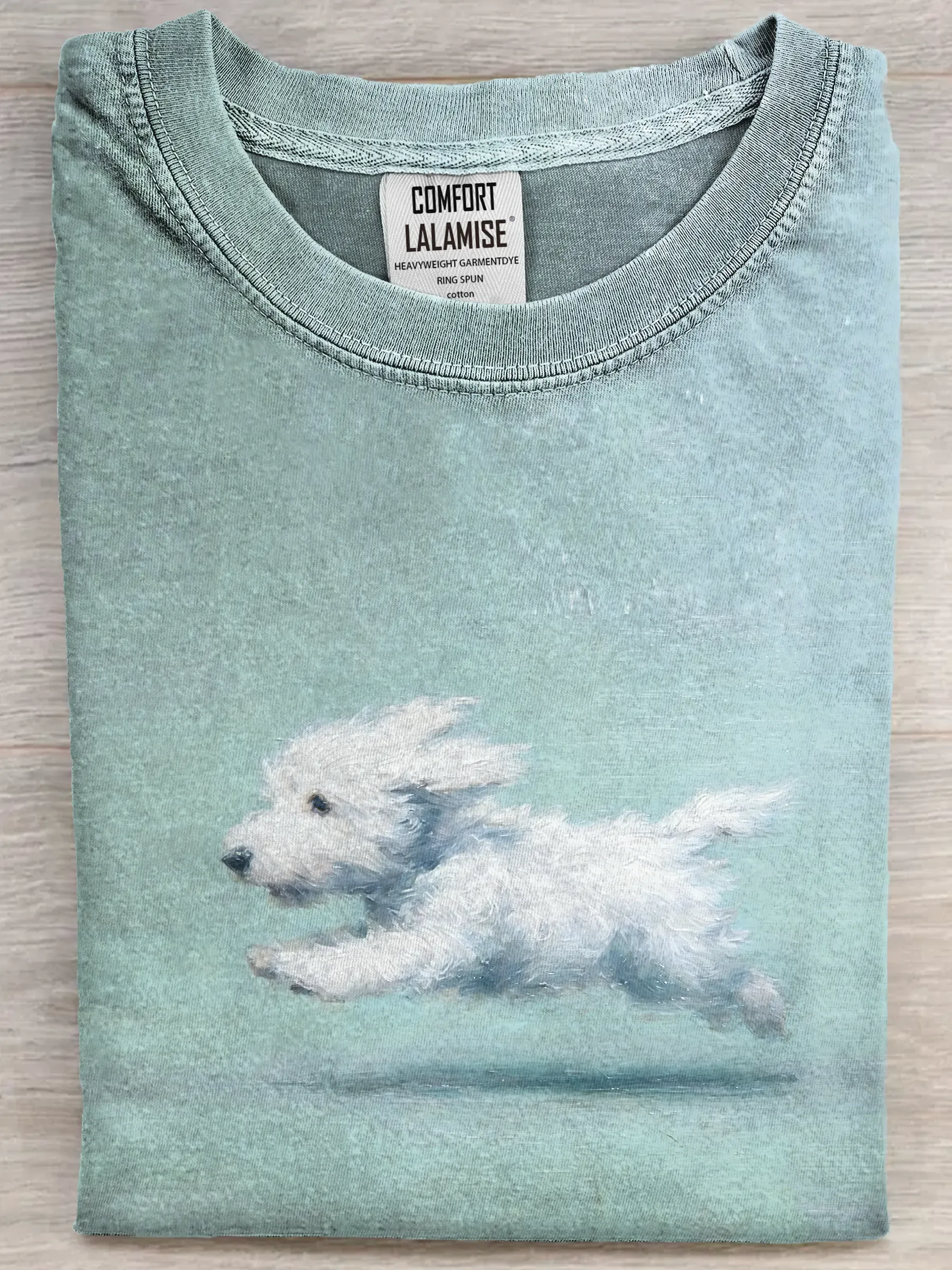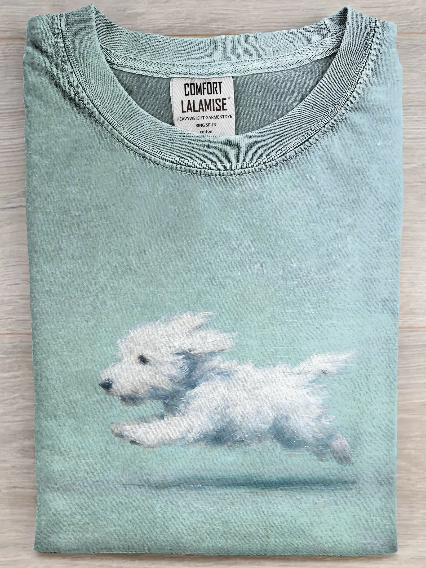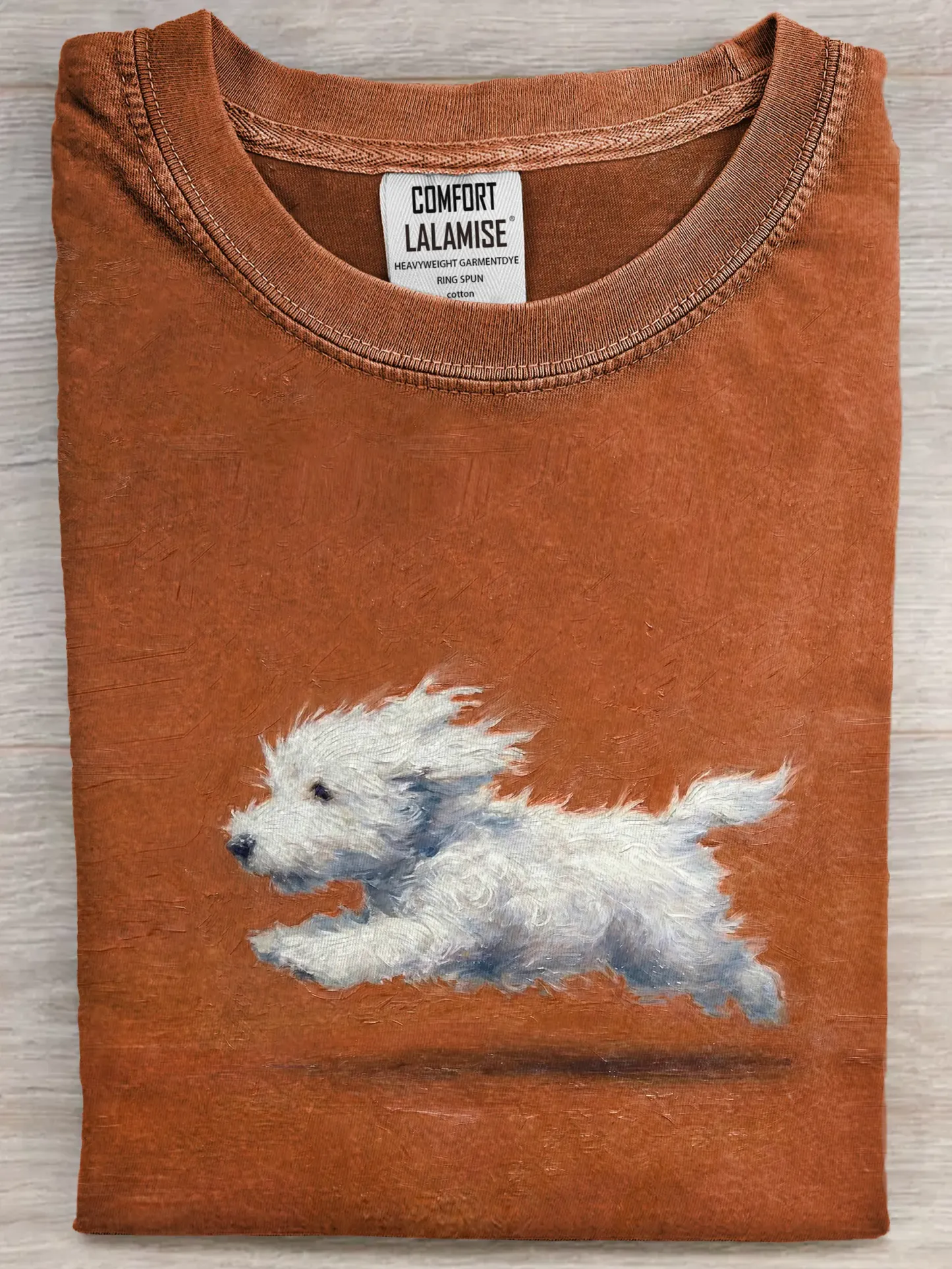 Funny Retro Cute Running White Dog Art Print Casual Cotton Short Sleeve T-shirt
