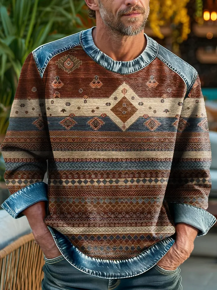 Mens Vintage Ethnic Geometric Geometric Grid Art Printed Casual Denim Patchwork Round Neck Sweatshirt