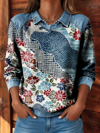 Vintage National Flower Patchwork Women's Art Print Long Sleeve Denim Mix Casual Sweatshirt