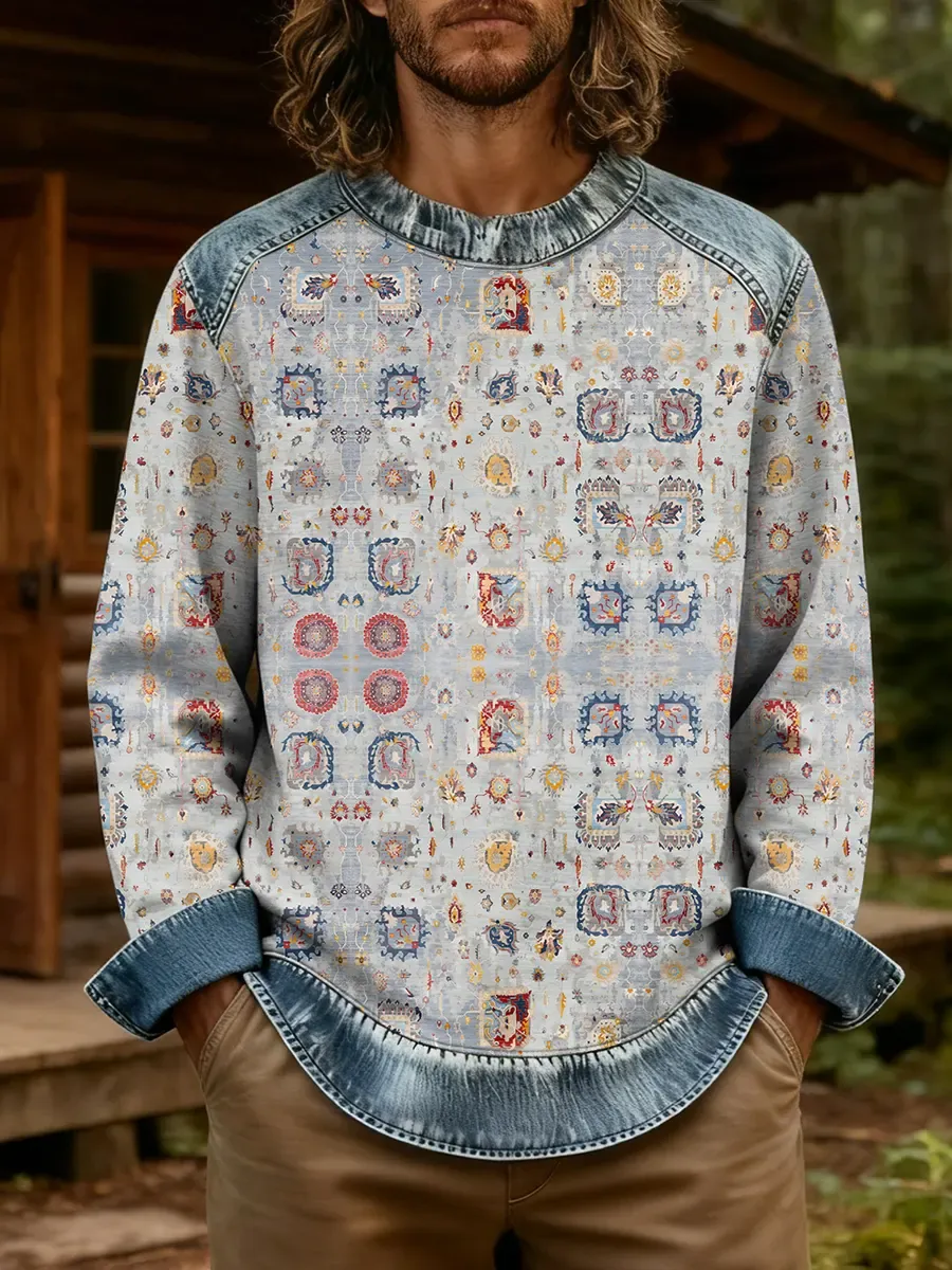 Vintage National Pattern Men's Art Print Long Sleeve Denim Mix Casual Sweatshirt