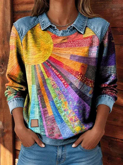 Vintage Sun Patchwork Women's Art Print Long Sleeve Denim Mix Casual Sweatshirt