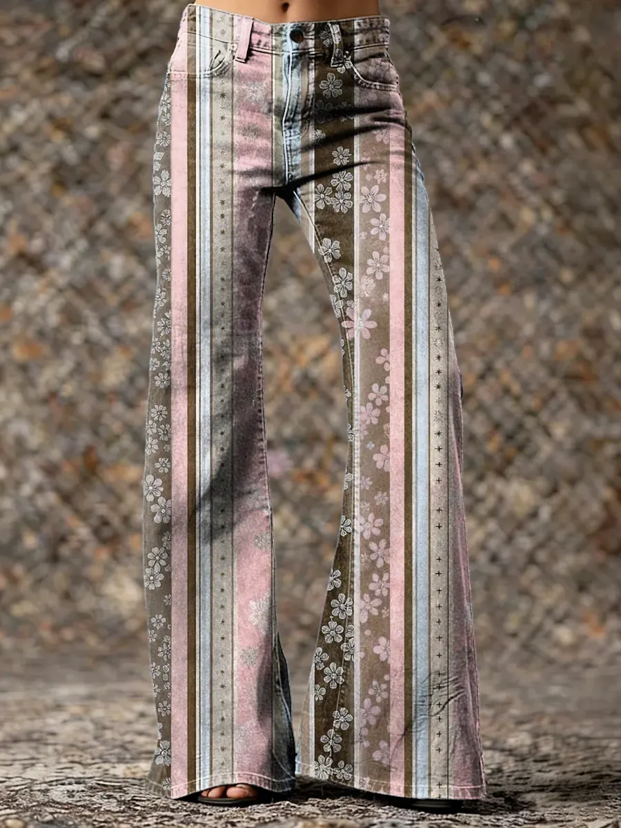 Women's Bohemian Striped Vintage Pattern Art Print Washed Denim Jeans