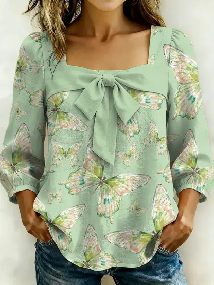 Women's Casual Bow Butterfly Print Cotton Shirt