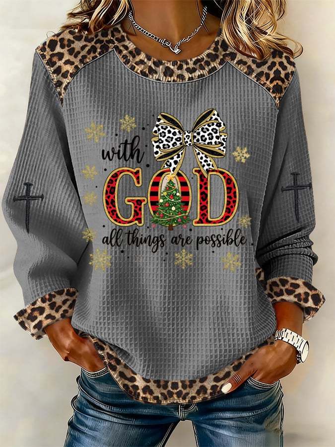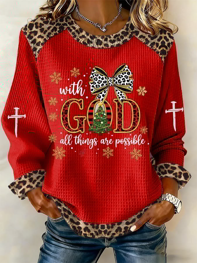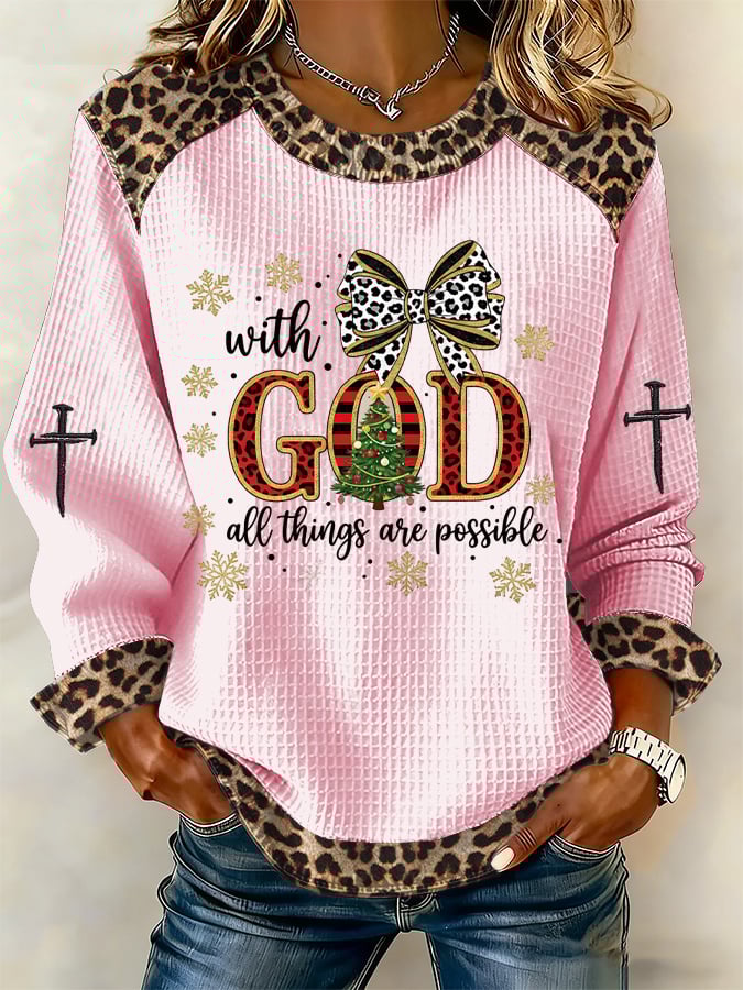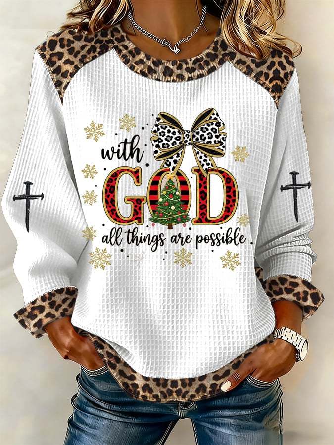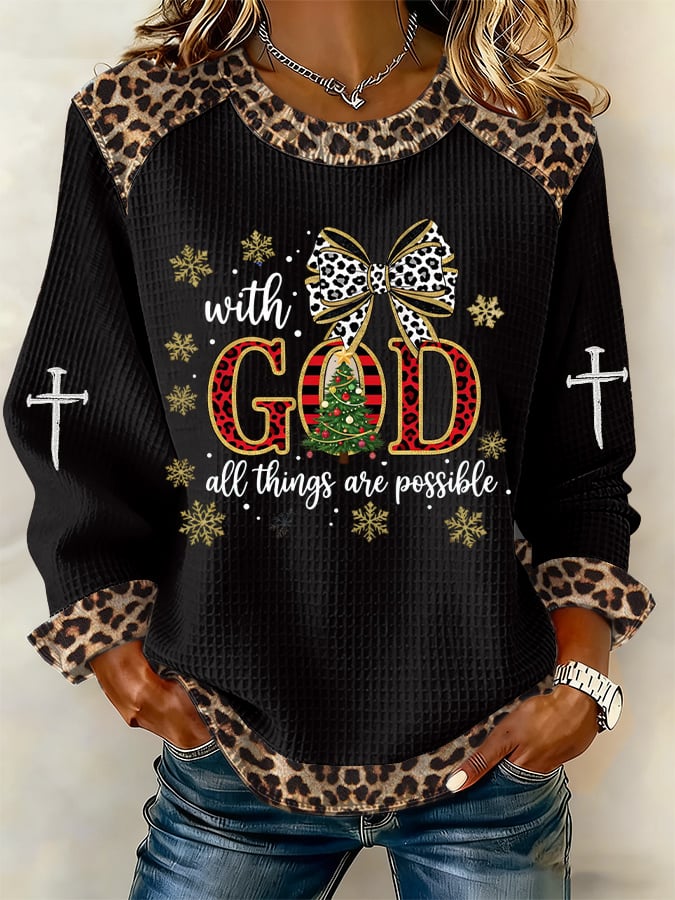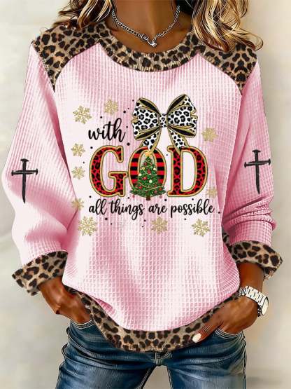 Women's Casual Leopard Print With God all things are possible Waffle Sweatshirt