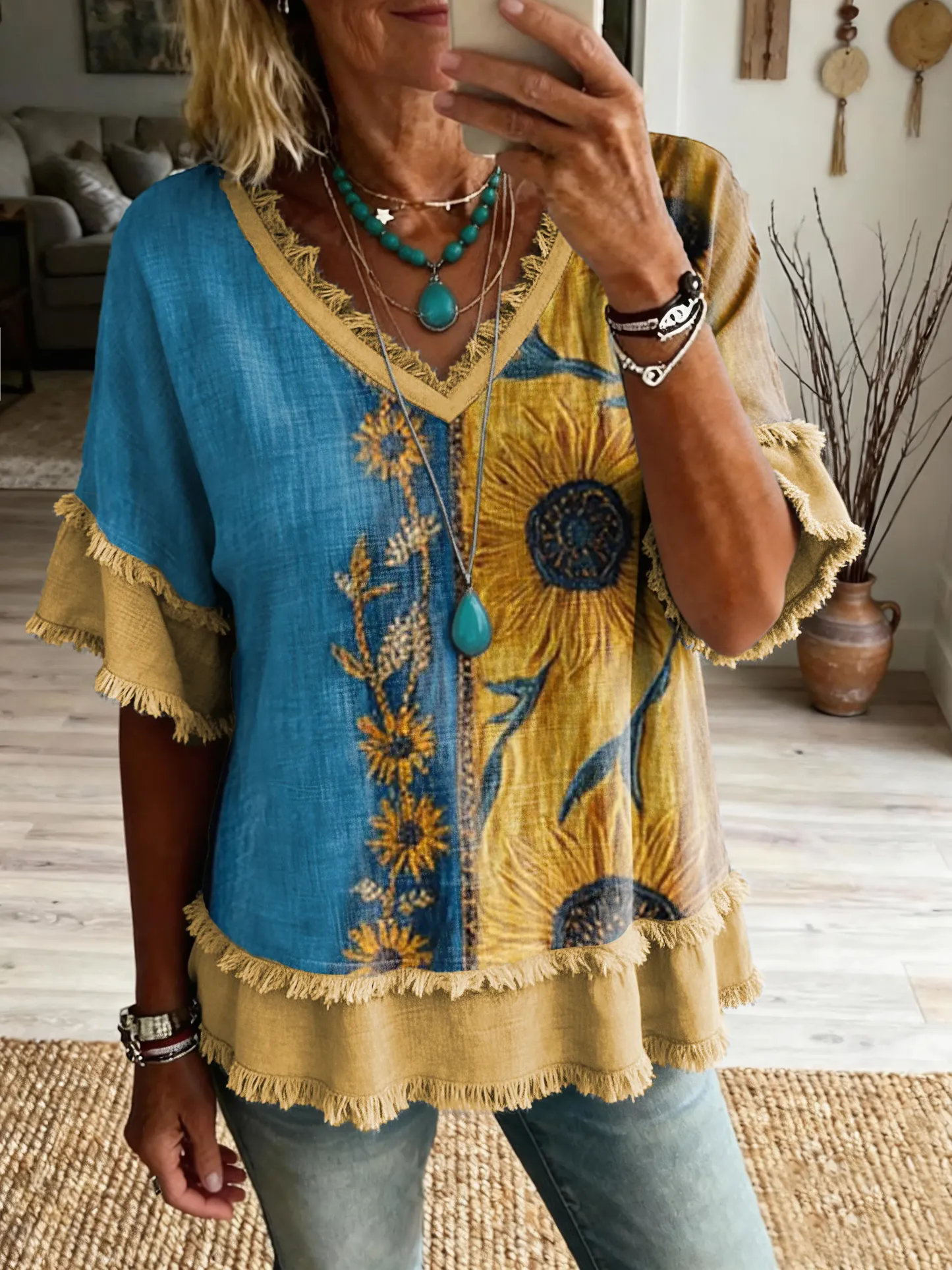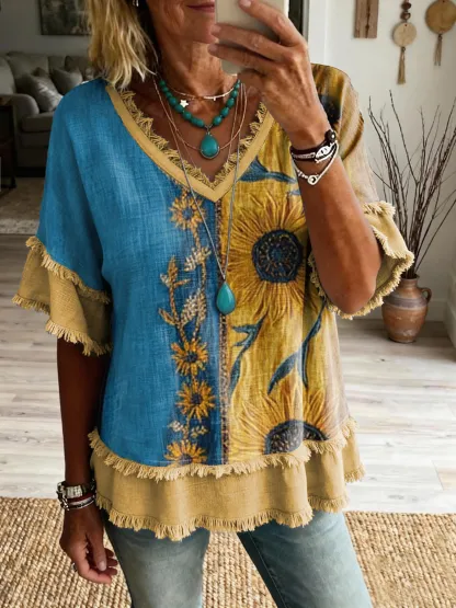 Women's Retro Bohemian Floral Art Print Casual V-Neck T-Shirt