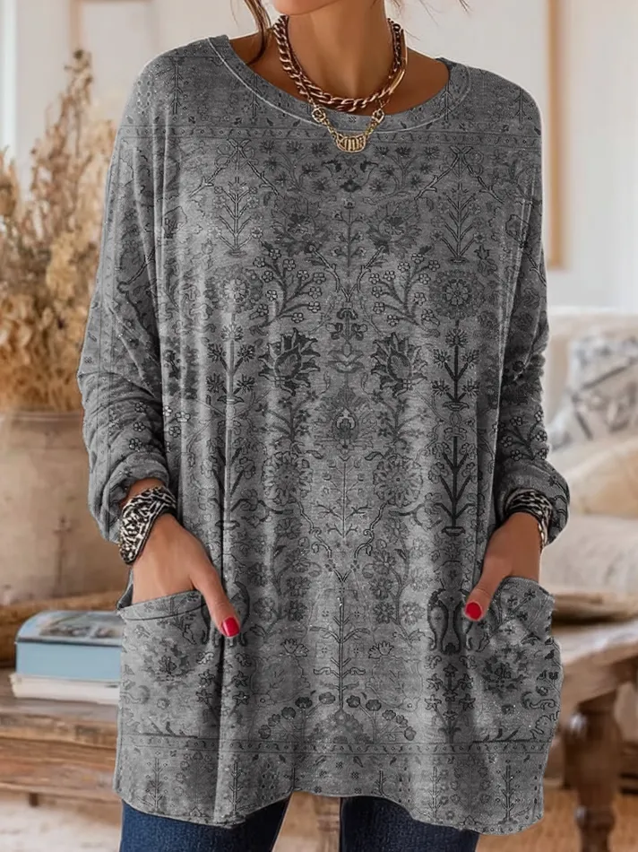 Women's Retro Ethnic Art Print Casual Long-Sleeve Round Neck Cotton T-Shirt