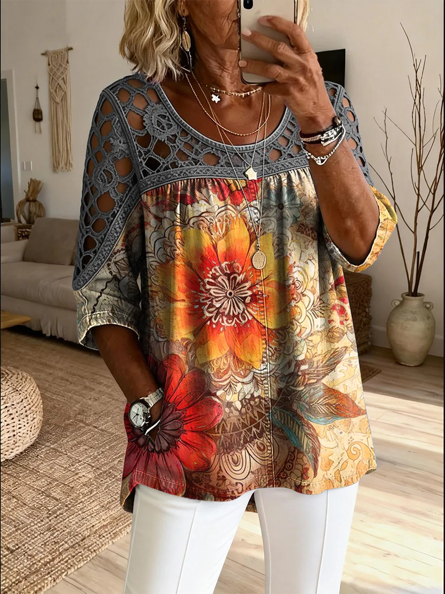 Women's Retro Ethnic Floral Art Print Casual Three-quarter Sleeve Round Neck Top
