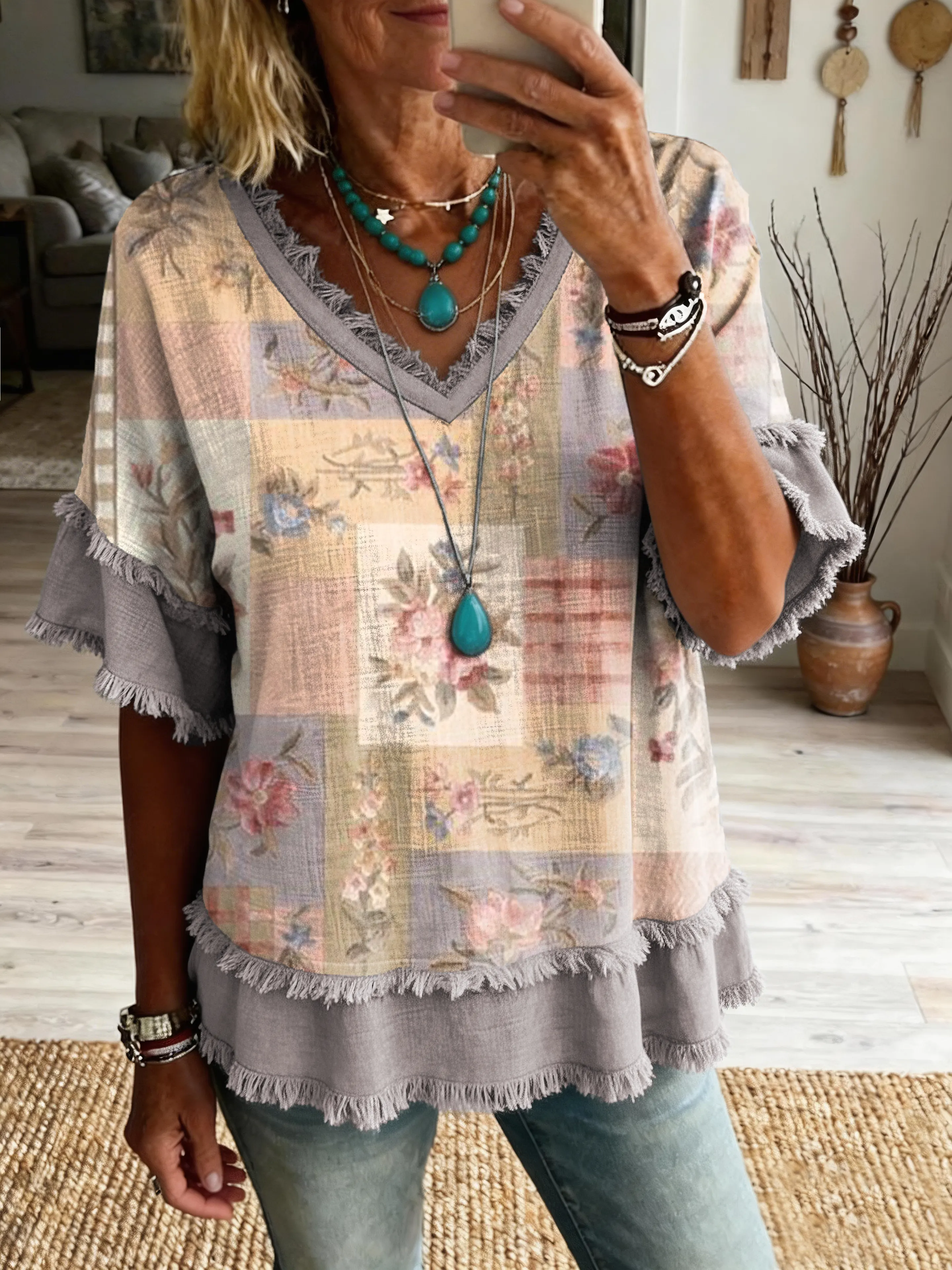 Women's Retro Patchwork Floral Art Print Casual V-Neck T-Shirt