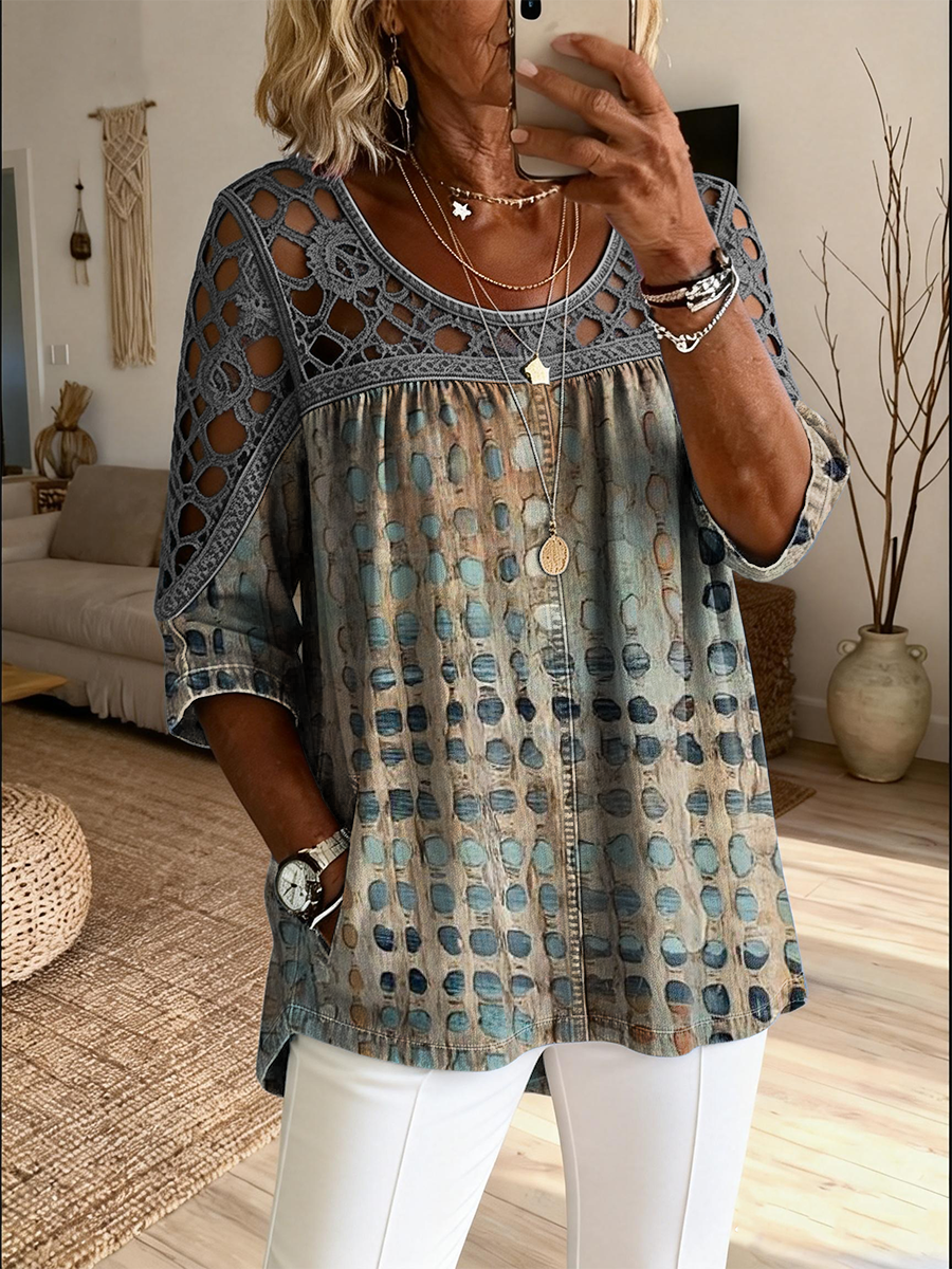 Women's Retro Polka Dot Art Print Casual Three-quarter Sleeve Round Neck Top