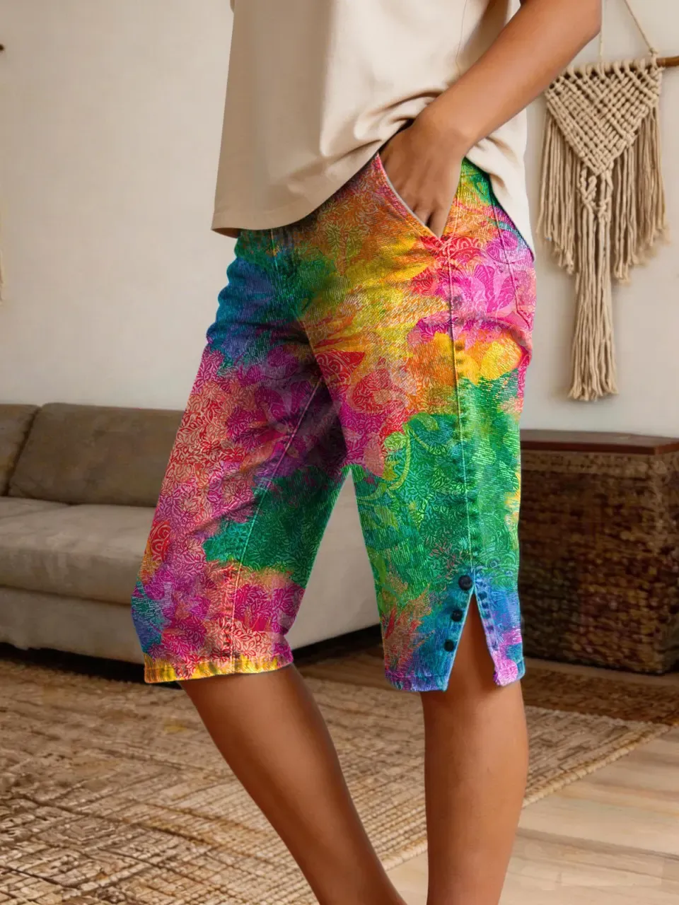 Women's Retro-Style Colorful Pattern Art Print Casual Denim Shorts
