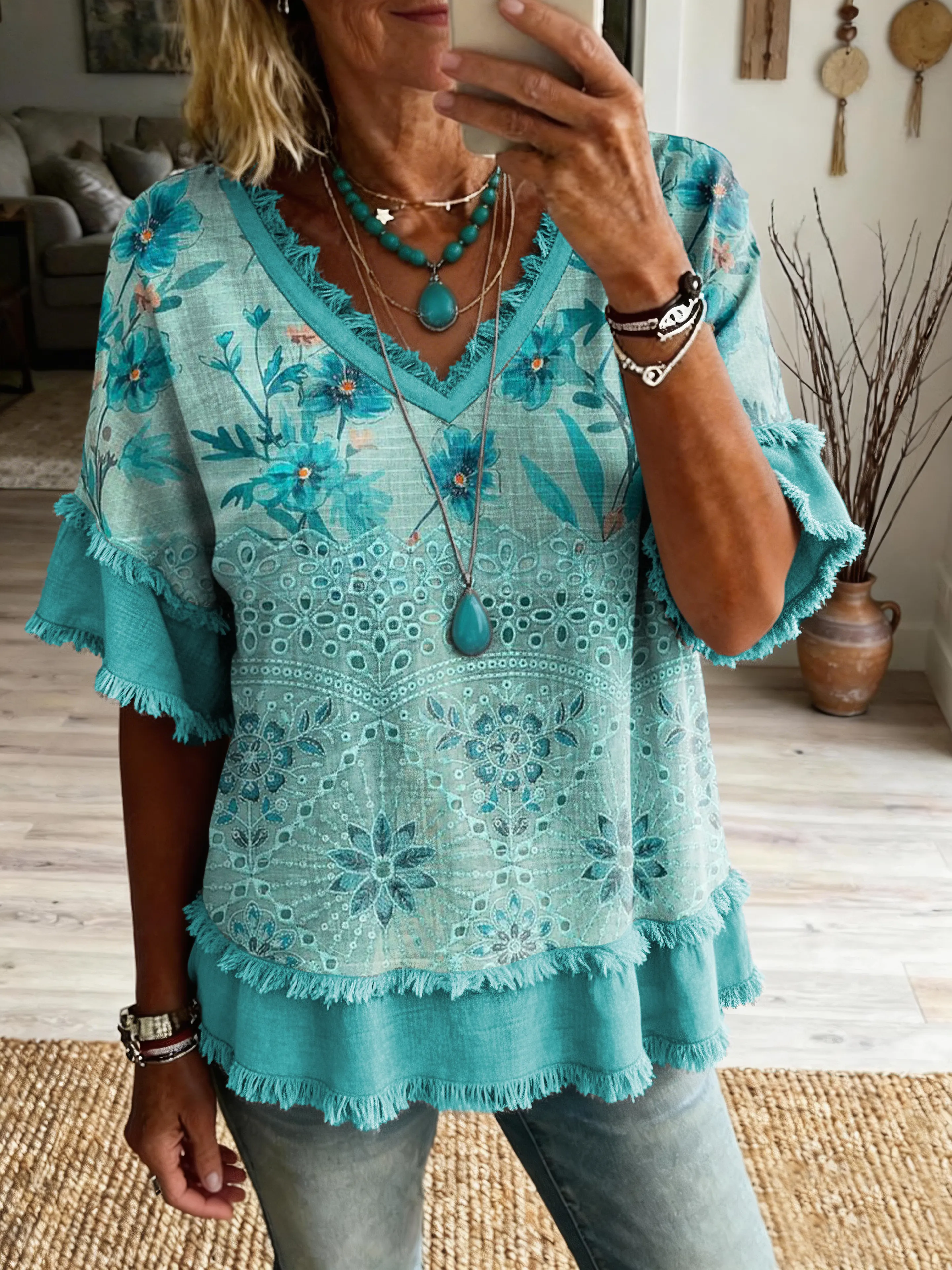 Women's Vintage Blue Textured Floral Art Print Casual V-Neck T-Shirt