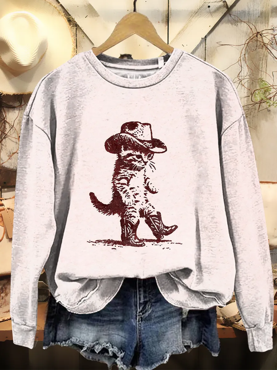 Women's Vintage Cute Pink Denim Kitten Art Print Casual Crewneck Pullover Sweatshirt