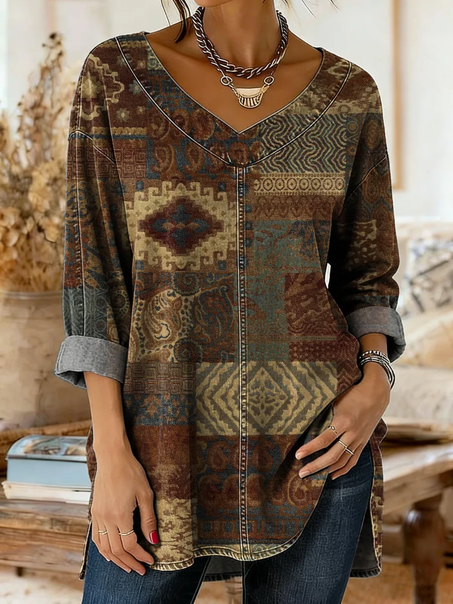 Women's Vintage Ethnic Collage Floral Art Print Casual V-neck Long Sleeve Washed Denim Shirt