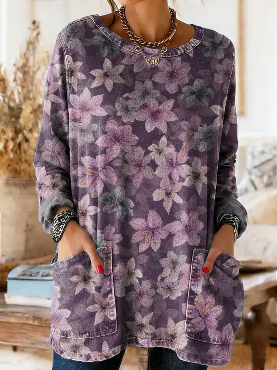 Women's Vintage Ethnic Purple Floral Art Print Casual Round Neck Denim Shirt