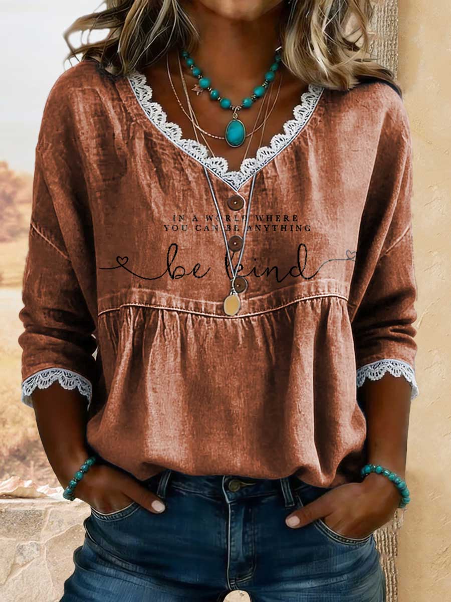 Women's Vintage In A World Where You Can Be Anything, Be Kind Print Casual Hollow-out Denim Shirt
