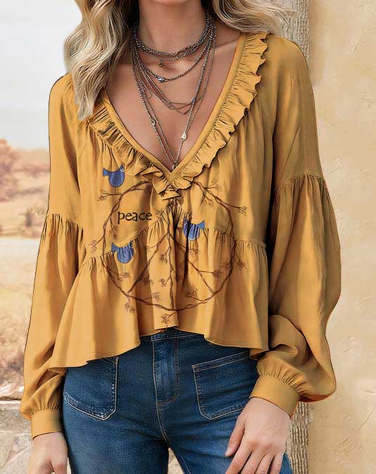 Women's Vintage Peace Sign Print Casual Long- Sleeved V- Neck Ruffled And Ruched Cotton Top