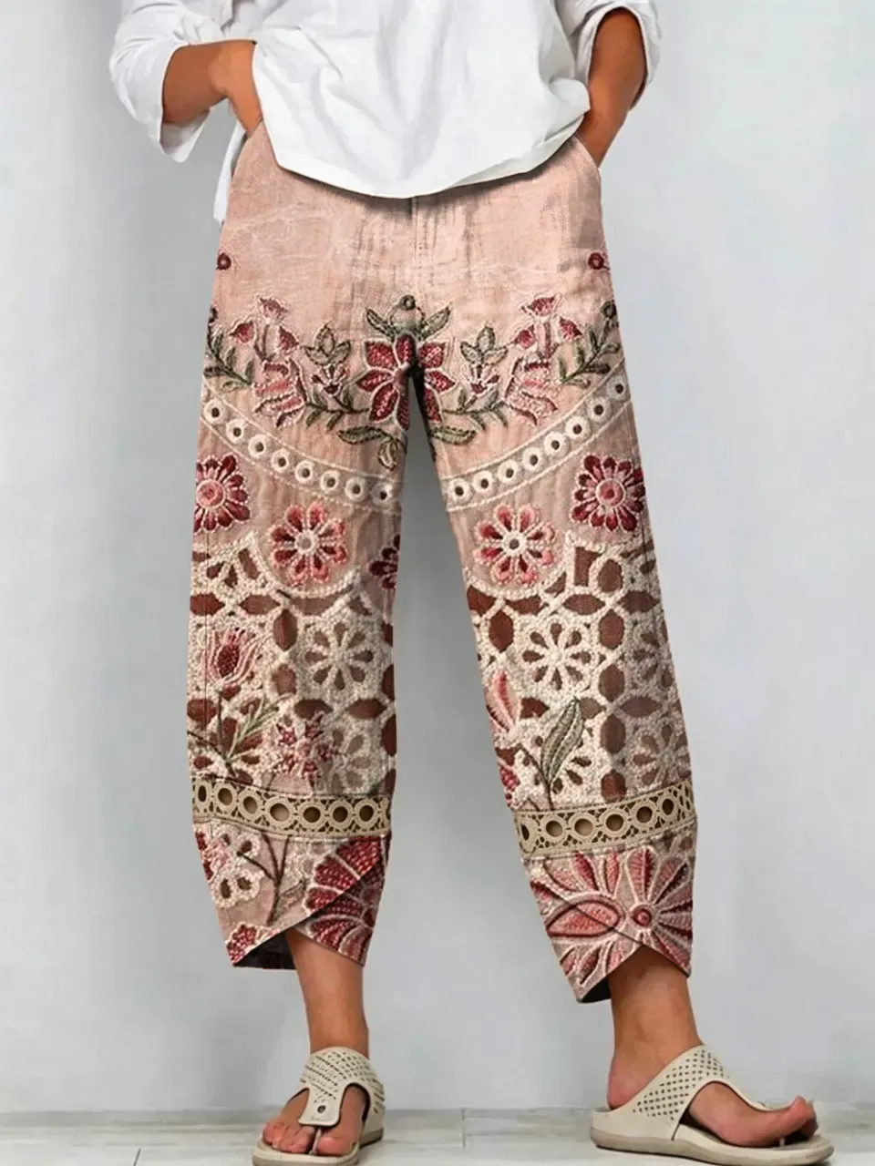 Women's Vintage Pink Textured Floral Art Print Casual Lace-Paneled T-Shirt