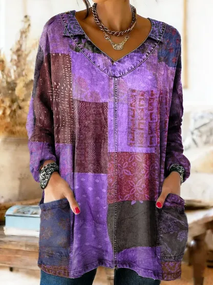 Women's Vintage Purple Collage Floral Art Print Casual V-neck Pocket Long Sleeve Washed Denim Shirt