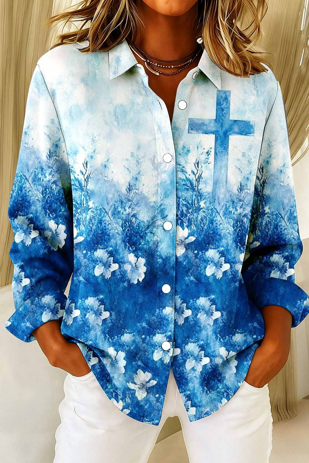 Women's Watercolor Cross Flower Pattern Print Casual Cotton Linen Shirt